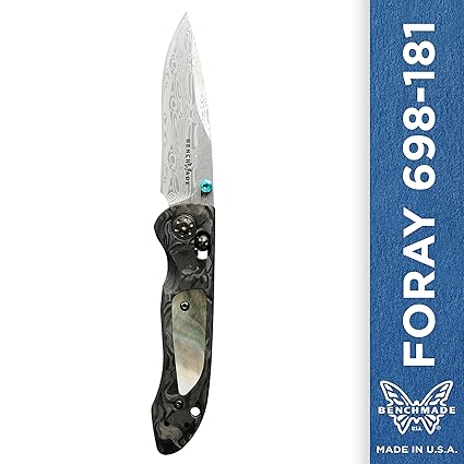 Benchmade Foray 698 181 Edc Manual Open Gold Class Folding Knife Made In Usa Drop Point Blade Plain Edge Damasteel Finish Marbled Carbon Fiber