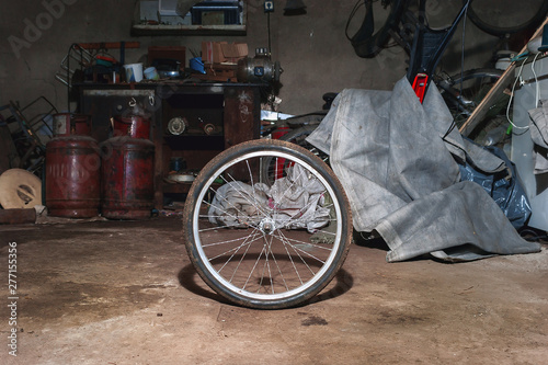 Dirty Bicycle Wheel On The Floor Of A Messy Home Garage With